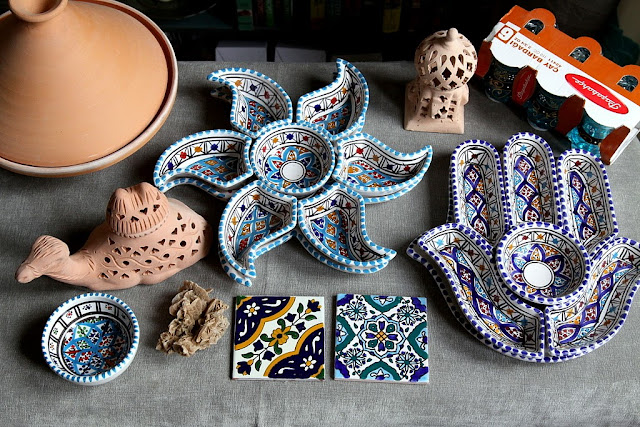 Ja z całego mnóstwa przepięknych naczyń kupiłam tradycyjne tagine, dwa zestawy miseczek, jeden w kształcie kwiatu, a drugi – w kształcie dłoni (Hamsa, dłoń Fatimy) – symbolu bardzo charakterystycznego dla Tunezji, można go spotkać najczęściej na lub nad drzwiami domów, na biżuterii, ozdobach, naczyniach, jednym słowem jest wszechobecny. Oznacza szczerość, otwartość, życzliwość i wybaczenie, stanowi także talizman ochronny.